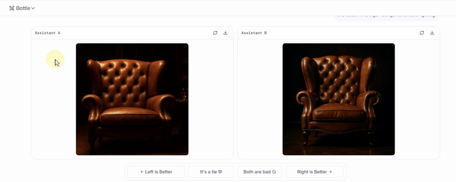 - 배틀 모드(Battle Mode): 두 개의 익명 AI 모델(Assistant A & B)이 생성한 결과물을 비교하여 어떤 것이 더 나은지 투표하는 방식입니다. 투표 후에야 모델의 정체가 공개됩니다.