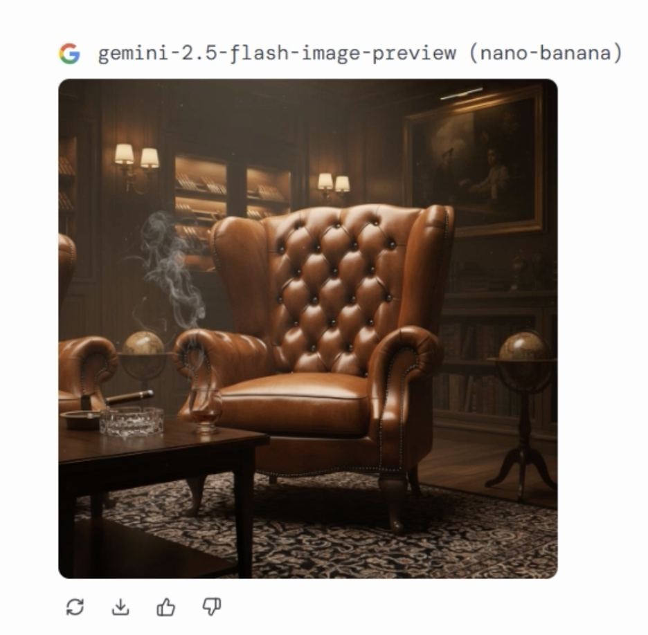 - 나노 바나나의 결과: 경쟁 모델들은 배경이 부자연스럽거나 소파의 질감을 살리지 못한 반면, 나노 바나나는 원본 소파를 완벽하게 유지하면서 고급스러운 시가 라운지의 분위기와 소품(위스키 등)을 완벽하게 합성해냈습니다.
