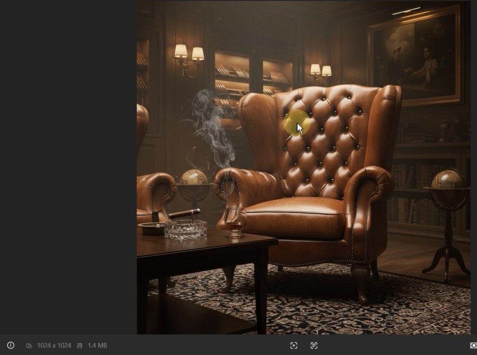 - 프롬프트: "시가 라운지(Cigar Lounge)에 놓인 소파, 시네마틱 조명 적용."