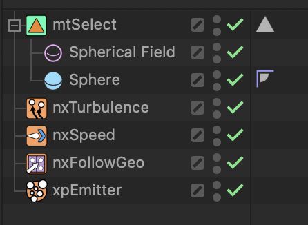mtSelect를 통해 Child로 있는 오브젝트의 면을 Noise 맵을 통해 애니메이션으로 설정하고 xpEmitter로 mtSelect에서 추출한 Polygon 선택태그에서 방출할 수 있도록 설정합니다. nxTurbulence로 랜덤한 움직임을 만들고 nxFollowGeo로 움직임을 선택된 Polygon 면에 한정시키고 속도가 너무 빠르지 않도록 nxSpeed로 제어합니다. 최종적으로 mtSelect에서 Field 영역에 Particle이 방출할 수록 설정할 수 있습니다.