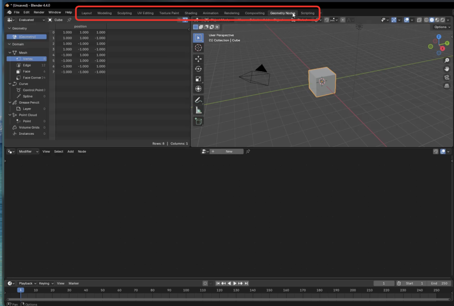 - 주요 탭: 모델링, 스컬핑, UV 에디팅, 텍스처 페인트, 셰이딩, 애니메이션, 렌더링, 컴포지팅, 지오메트리 노드 등.
