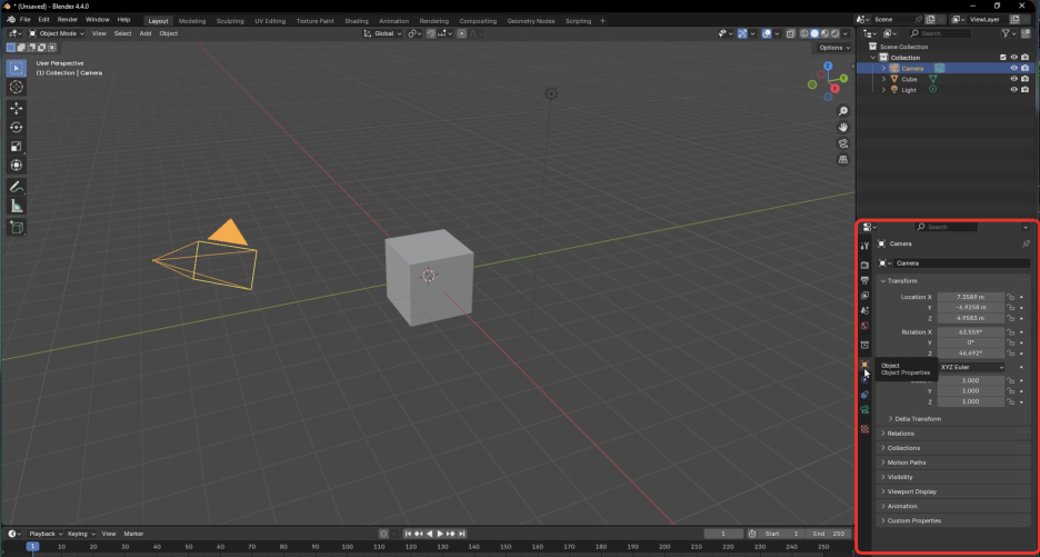 새 파일을 열면 항상 세 가지 기본 오브젝트가 포함되어 있습니다.