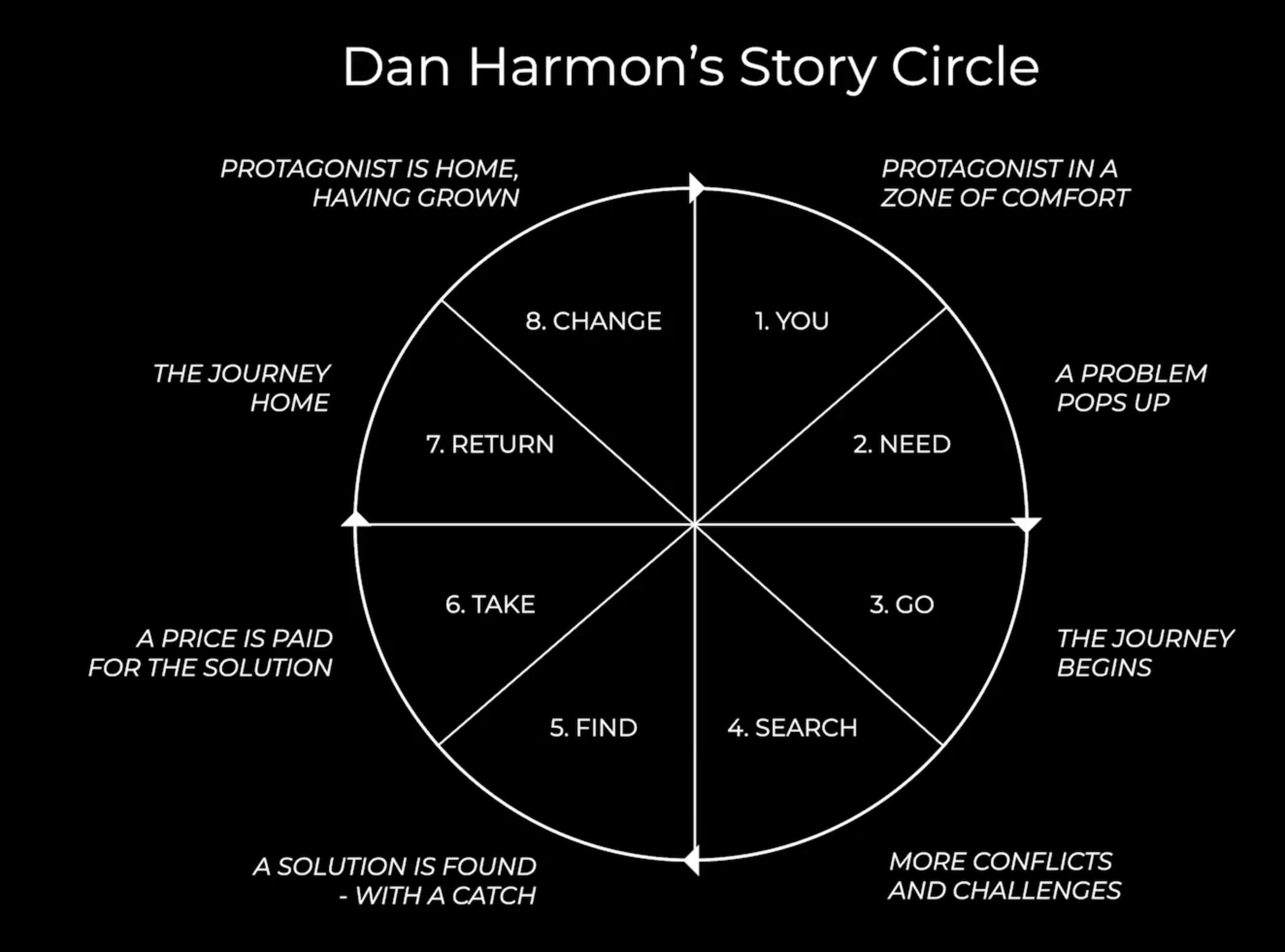 제가 가장 간단하고 강력하다고 생각하는 방식은 바로 **댄 하몬의 스토리 서클(Dan Harmon’s Story Circle)**이에요. 댄 하몬은 《커뮤니티》와 《릭 앤 모티》의 공동 창작자로, 반복되는 스토리 구조 속에서도 늘 흥미로운 이야기를 만들어내는 데 능숙한 사람입니다. 이 구조는 흔히 **“순환형 이야기 엔진”**이라고 불리며, 캐릭터를 반복적으로 새로운 상황에 던져 넣어도 관객이 계속 따라오게 만드는 매우 견고한 방식입니다.