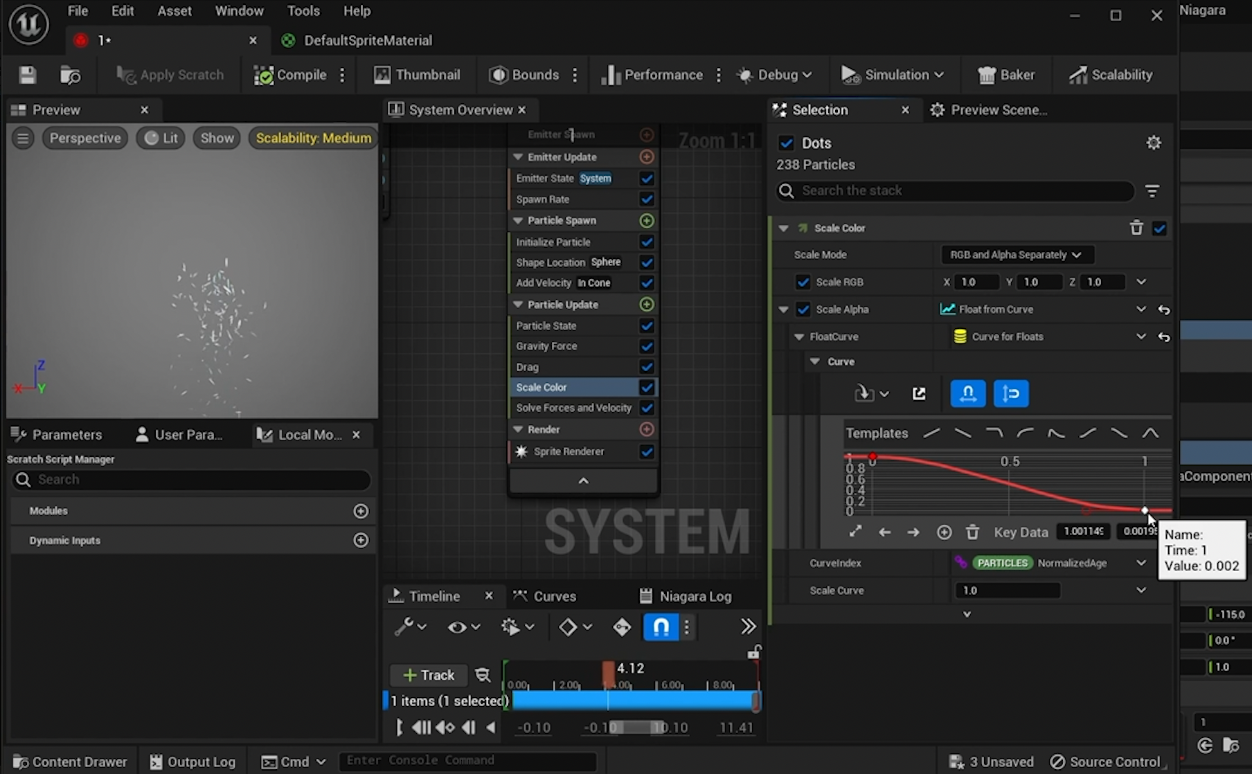 강의 후반에서는 Scale Color를 이용해 파티클이 시간에 따라 사라지는 방식을 조절합니다. 실제로는 색뿐 아니라 알파를 다루는 데 자주 쓰이기 때문에, 파티클의 등장과 퇴장을 자연스럽게 만드는 모듈로 이해하면 좋습니다.