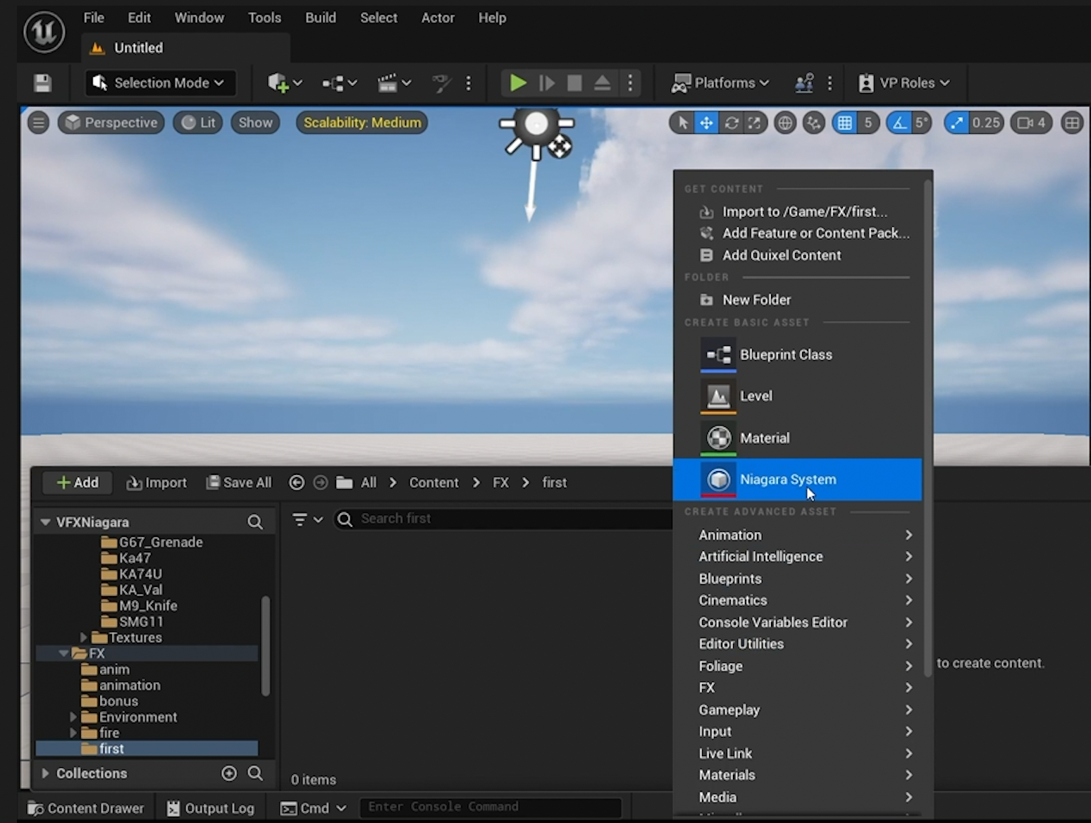 강의는 먼저 Niagara System을 만드는 과정부터 시작합니다. 여기서 중요한 것은 Niagara를 완전히 빈 상태에서 접근하기보다, 기존 템플릿을 활용해 출발하는 방식이 초보자에게 훨씬 효율적이라는 점입니다.