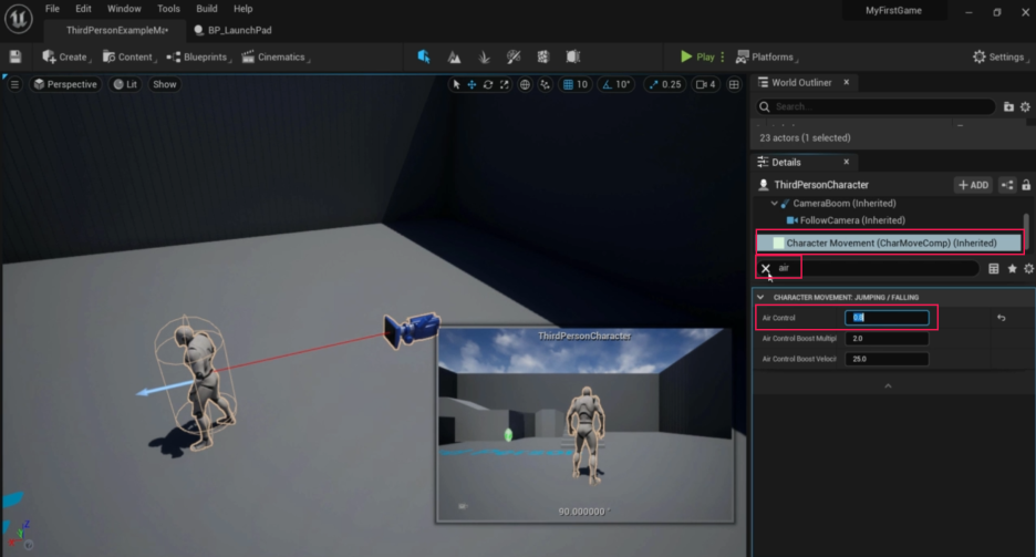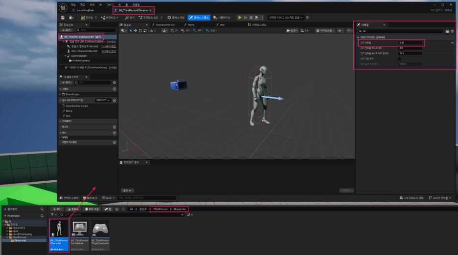 - Air Control: 캐릭터 무브먼트 컴포넌트에서 'Air Control' 값을 높여(예: 0.8) 공중 제어력을 높입니다.