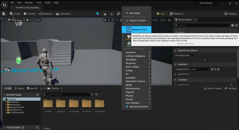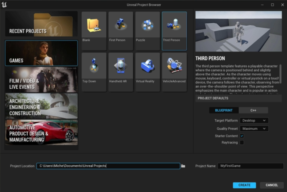 - 템플릿 선택: 'Games' 카테고리에서 'Third Person(3인칭)' 템플릿을 선택합니다.