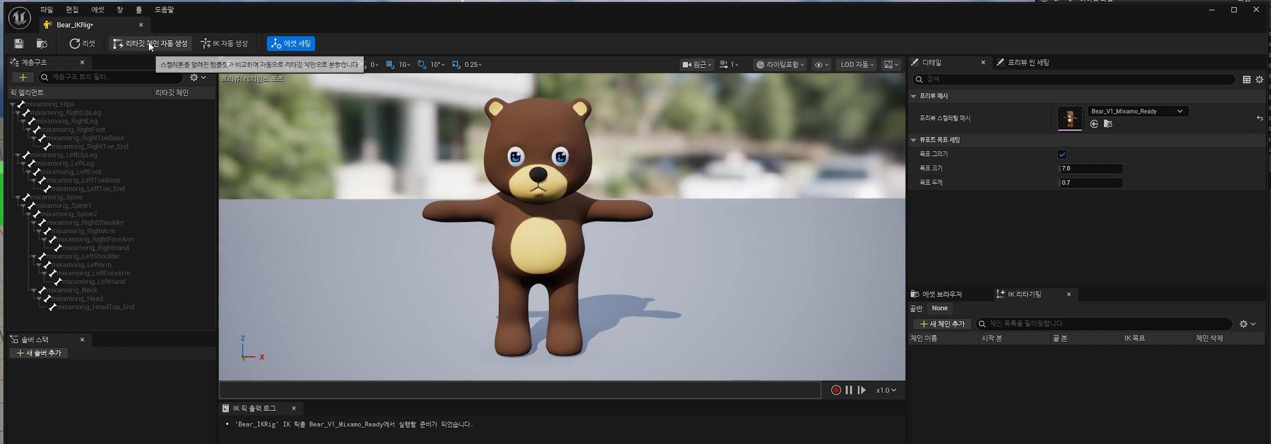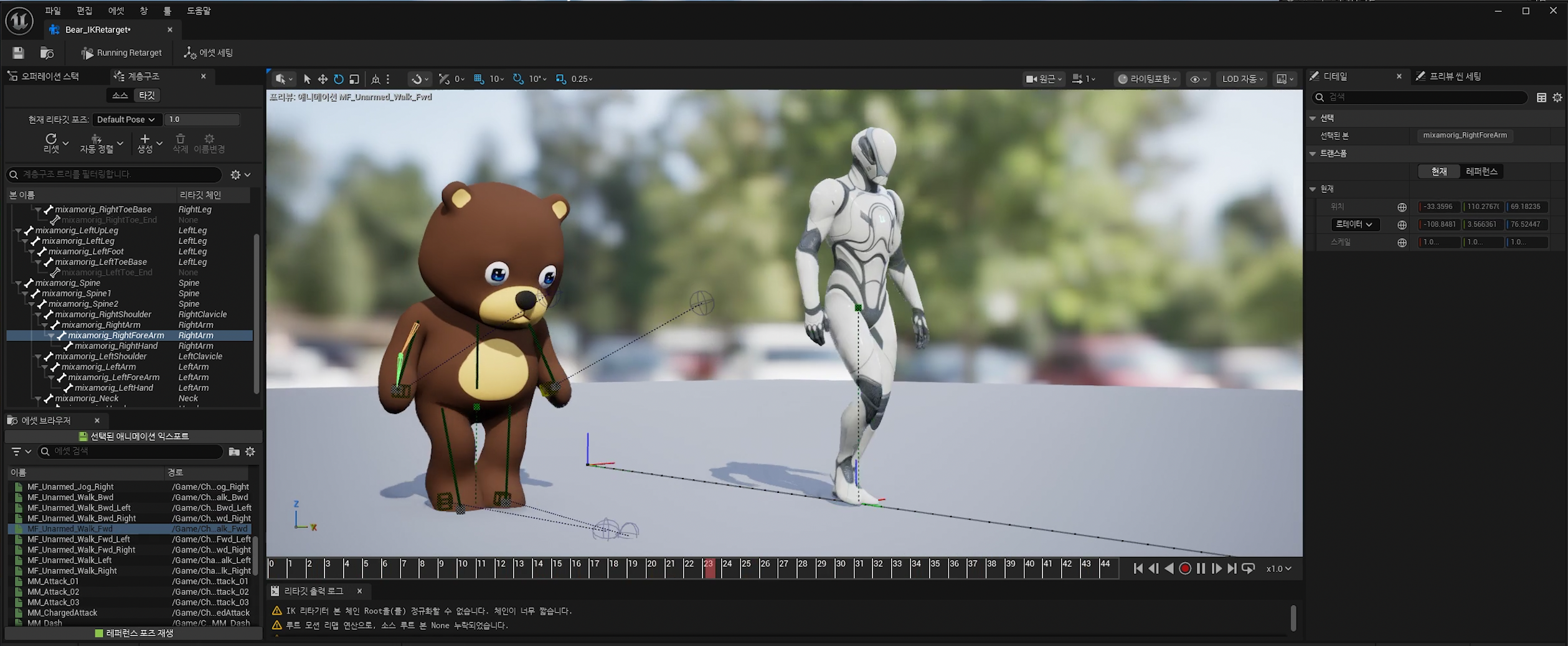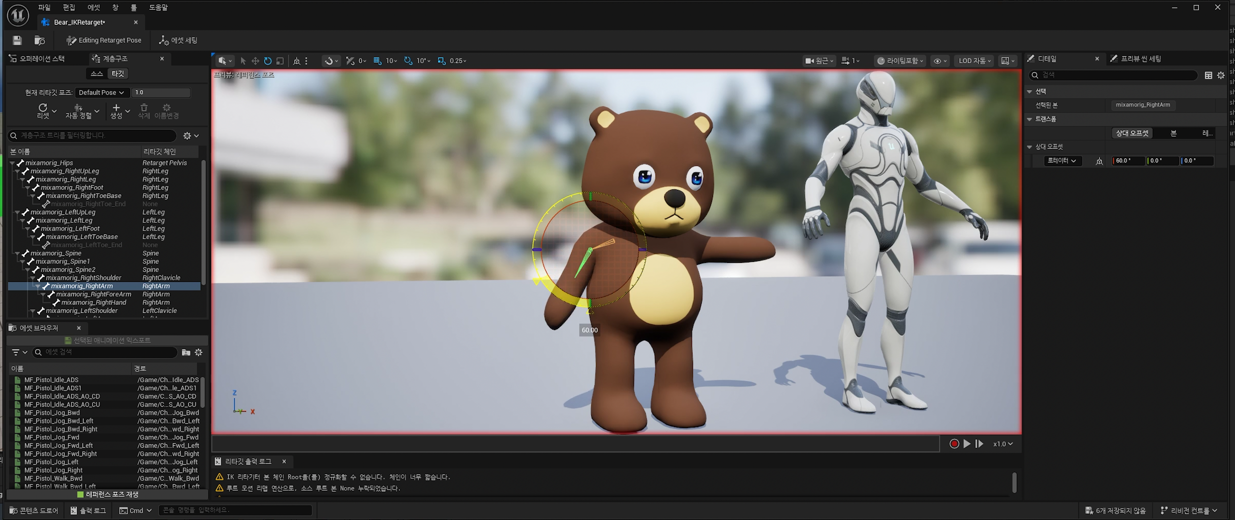 이제 IK Retargeter를 열어서 소스 캐릭터와 타깃 캐릭터를 연결합니다. 보통 소스는 마네킹이나 서드퍼슨 템플릿 애니메이션이 되고, 타깃은 Bear 같은 새 캐릭터가 됩니다. 이 단계에서는 체인 매핑이 제대로 연결되어 있는지 확인하는 것이 중요합니다. 체인이 빠지거나 잘못 연결되면 특정 부위만 이상하게 움직일 수 있습니다.