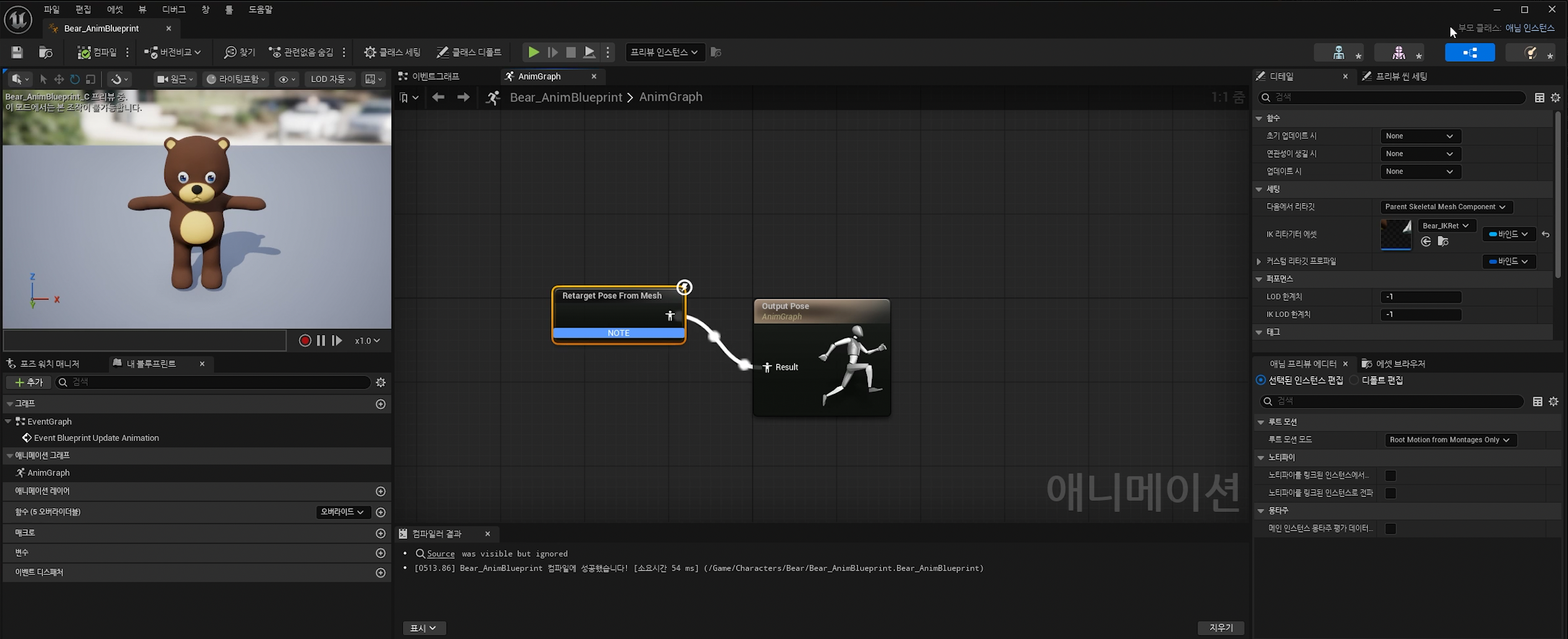 미리보기에서 괜찮게 보였다면 이제 실제 캐릭터에 적용하셔야 합니다. Character Blueprint에서 BearMesh를 연결하고, Animation Blueprint에서 Retarget Pose From Mesh 같은 노드를 사용해 리타겟 결과가 실제 게임 캐릭터에 반영되도록 만듭니다. 이 단계까지 완료되어야 단순한 편집 화면이 아니라 실제 플레이 흐름에서 애니메이션이 작동하게 됩니다.