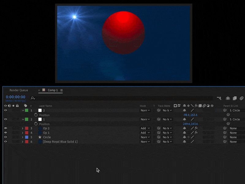 연결한 Null를 Circle 레이어에 Parent를 하면 Optical Flare의 위치가 벗어나는 것을 볼 수 있다.