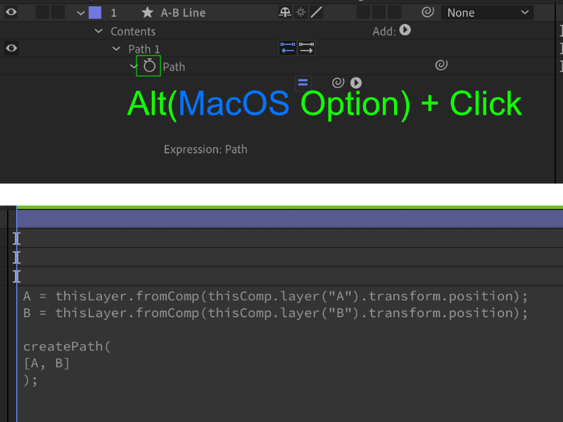 시계마크를 Alt + Click(Mac이면 Option + Click)를 해주고 타이핑을 해줍니니다. createPath()는 Shape 레이어에서 Path를 만드는 메서드입니다.