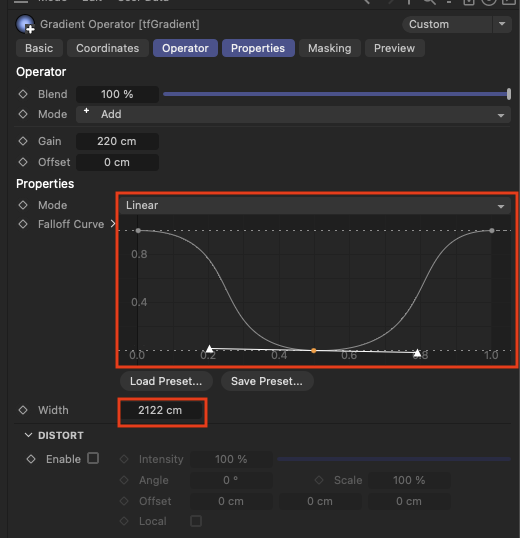 - 트로프 만들기: TF Terrain을 사용하여 그라디언트 오퍼레이터로 트로프를 만듭니다. 그라디언트 타입을 선형으로 변경하고, 좌표를 회전시켜 트로프를 설정합니다.