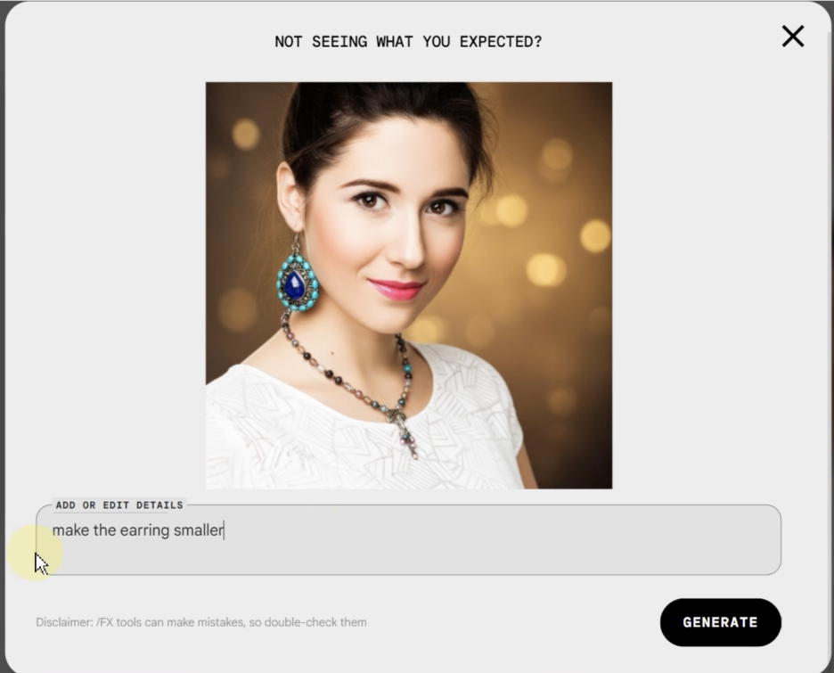 - 해결 방법 (프롬프트 수정): 결과물이 마음에 들지 않을 경우, AI에게 직접 **"귀걸이를 조금 더 작게 만들어줘(make the earring smaller)"**와 같은 추가 지시어(Prompt)를 입력하여 결과물을 정교하게 다듬어 나갑니다.