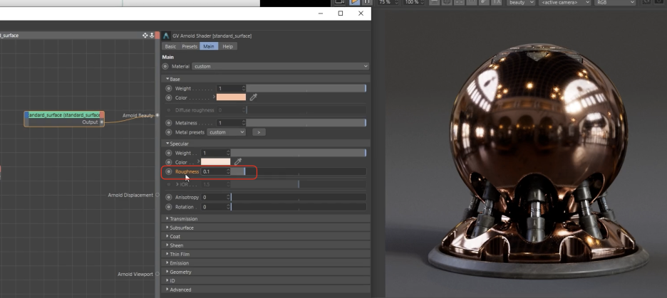 Standard Surface 셰이더의 Base는 물체의 확산광을 담당하며 현실적인 색상 범위를 지키는 것이 중요합니다. 금속 재질을 만들 때는 Metalness를 1로 올리고, 프리셋을 활용하거나 Base/Specular Color를 조합하여 원하는 금속의 톤을 맞춘 뒤, Specular Roughness로 마무광 정도를 조절합니다.
