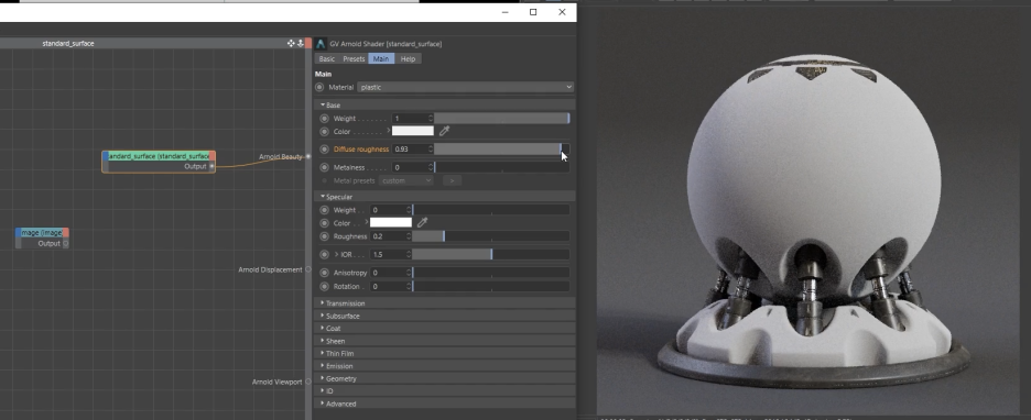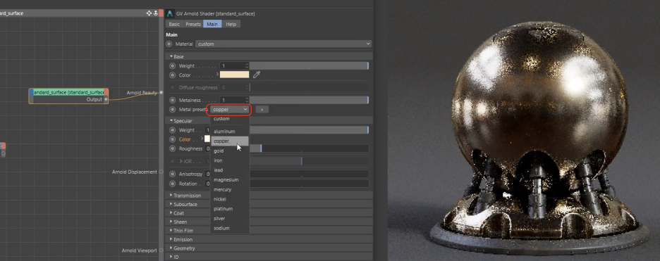 Arnold의 핵심 셰이더인 Standard Surface의 기초와 Base(기본) 및 Metalness(금속성) 파라미터에 대한 내용입니다.