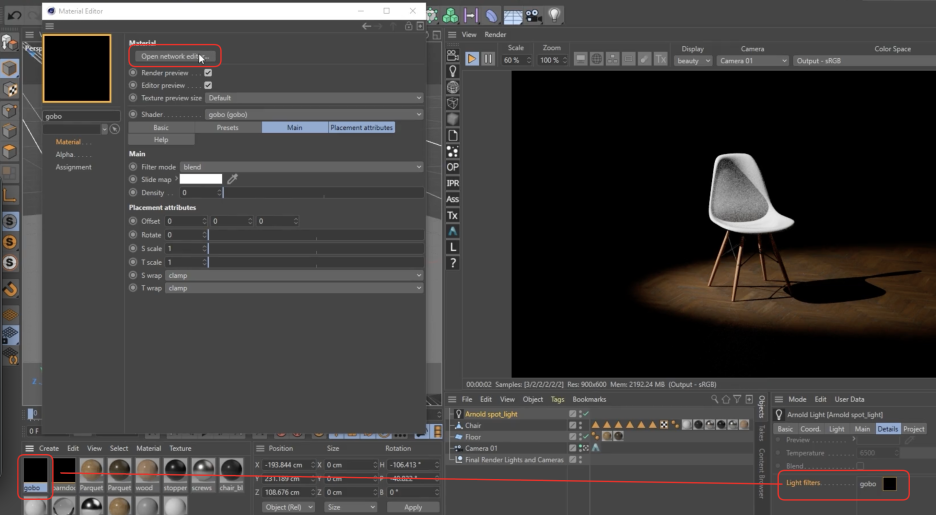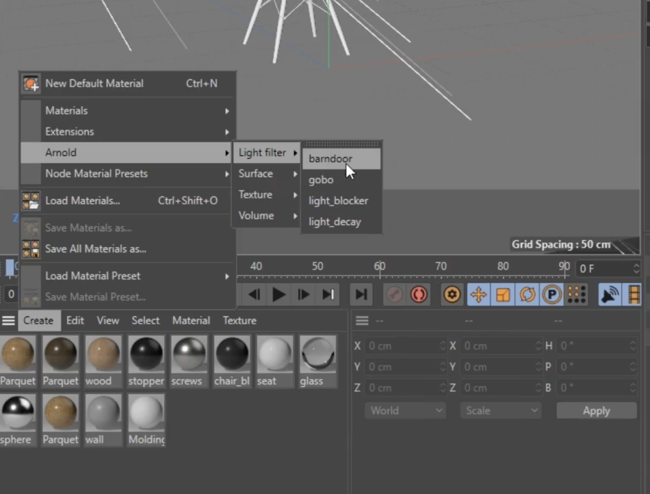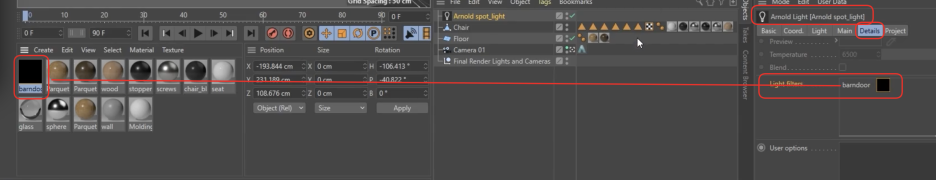 라이트 필터는 셰이더의 일종으로, 조명의 효과를 물리적 혹은 예술적으로 수정하는 도구입니다. Material Manager > Create > Arnold > Light Filter에서 생성하며, 조명의 Detail 탭에 있는 Light Filters 리스트에 등록하여 사용합니다.