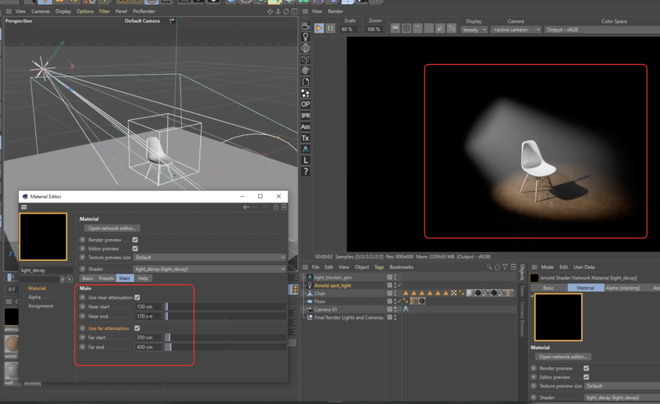 - Near Attenuation (근거리 감쇠): 빛이 나타나기 시작하는 거리(Start)와 최대 밝기에 도달하는 거리(End)를 설정합니다.