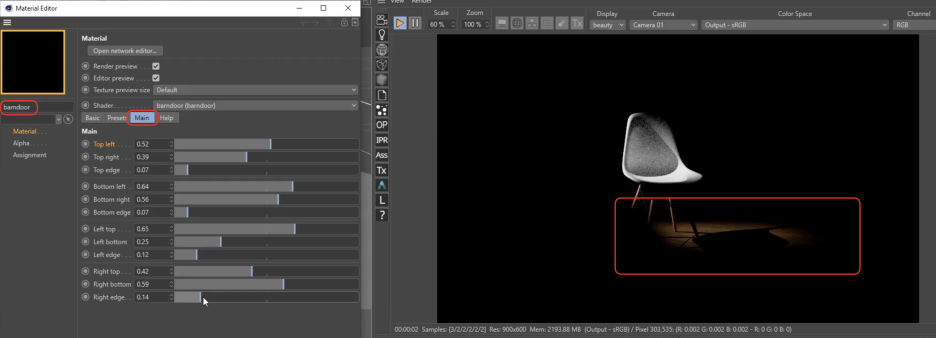- 설정: 상(Top), 하(Bottom), 좌(Left), 우(Right) 4개의 플랩(Flaps) 매개변수를 조정하여 빛의 범위를 조절합니다.