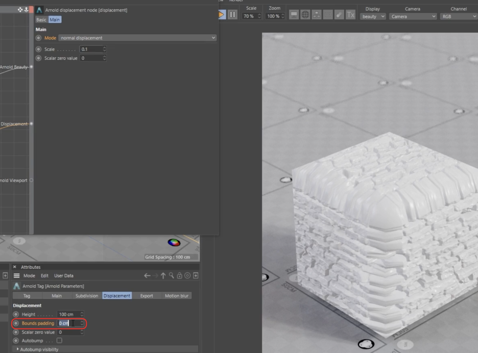 - Bound Padding: 매우 중요한 설정입니다. 디스플레이스먼트로 인해 물체가 원래 크기보다 커질 때, 계산 영역(Bounding Box)을 확장해 주어 렌더링 시 잘림 현상을 방지합니다.