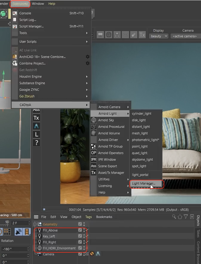 라이트 매니저는 조명 배치와 속성 설정의 편의성을 극대화하며, 라이트 그룹은 합성(Post-production) 단계에서의 유연성을 제공합니다. 특히 많은 라이트가 포함된 실내 씬이나 제품 광고 렌더링에서 이 워크플로우는 필수적입니다.