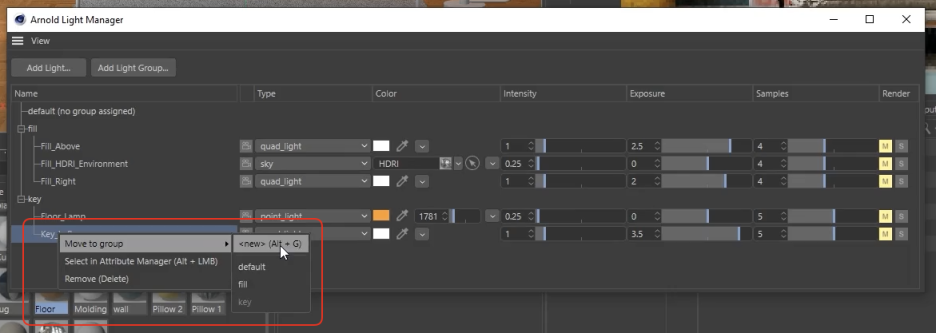 - 그룹 생성 및 할당: 1. 라이트 매니저 내에서 그룹을 생성하고 이름을 지정합니다 (예: Key, Fill).