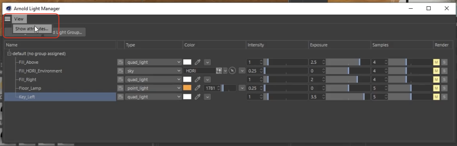 여러 개의 조명을 하나의 창에서 통합 관리할 수 있는 도구입니다. (Arnold Menu > Arnold Light > Light Manager)