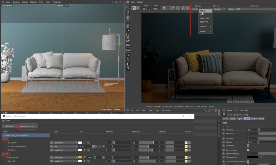 라이트 매니저는 조명 배치와 속성 설정의 편의성을 극대화하며, 라이트 그룹은 합성(Post-production) 단계에서의 유연성을 제공합니다. 특히 많은 라이트가 포함된 실내 씬이나 제품 광고 렌더링에서 이 워크플로우는 필수적입니다.