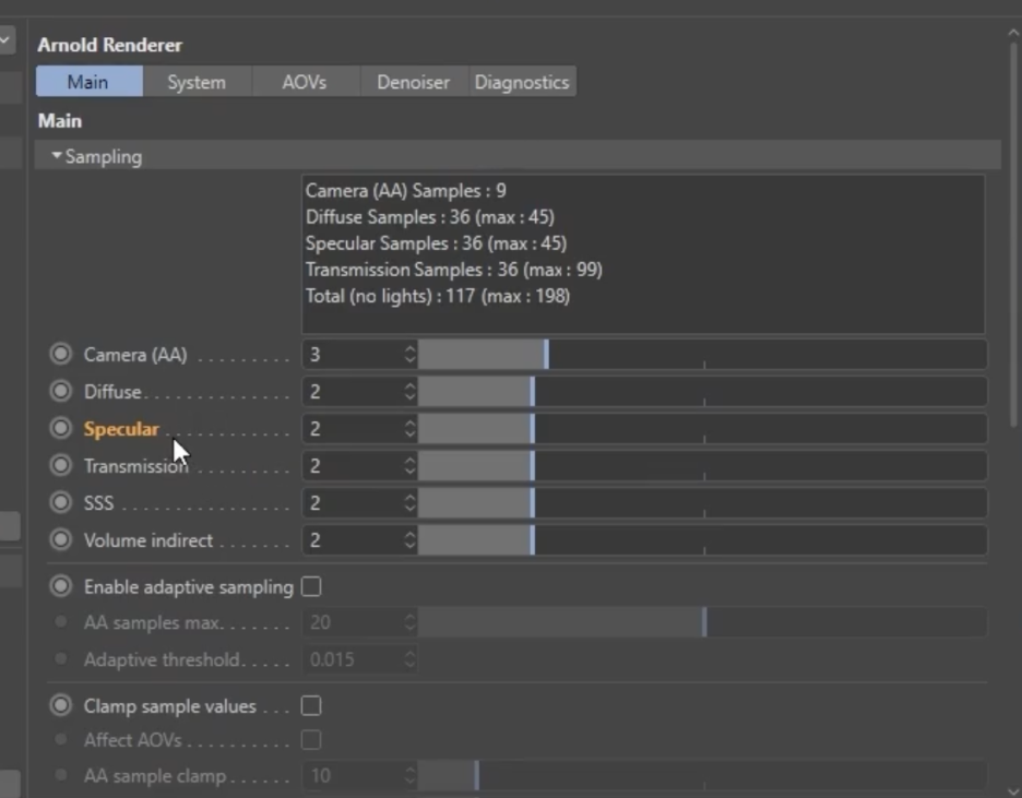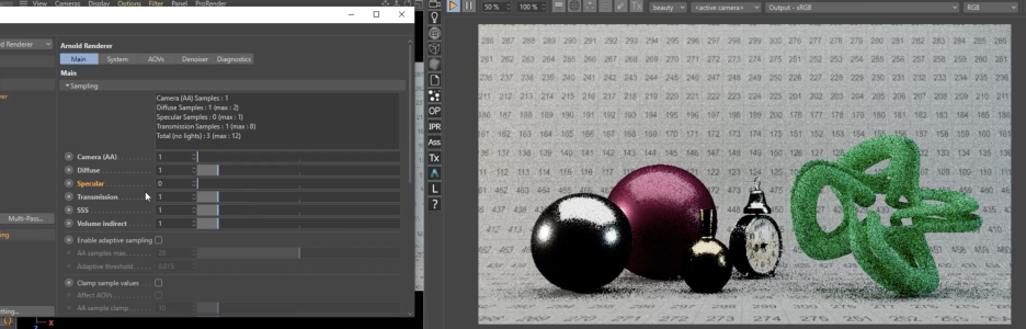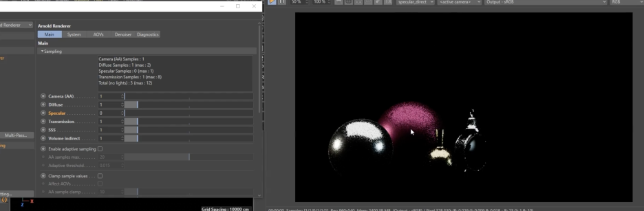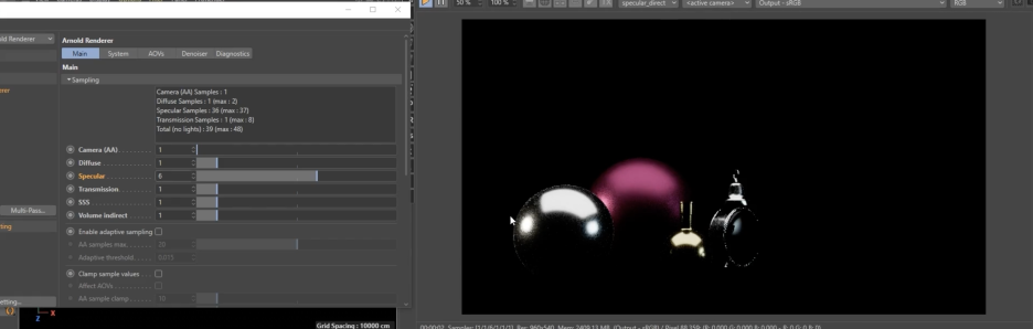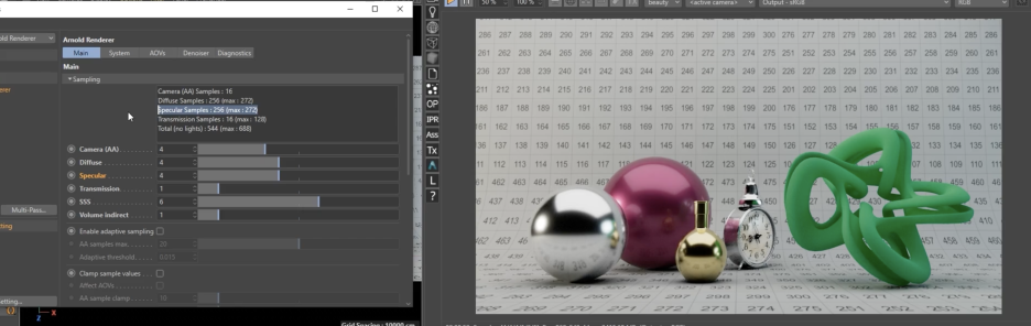 Arnold 렌더에서 **스펙큘러 샘플(Specular Samples)**을 통해 간접 반사(Indirect Reflections)의 품질을 조절하고 노이즈를 제거하는 방법에 관한 것입니다.