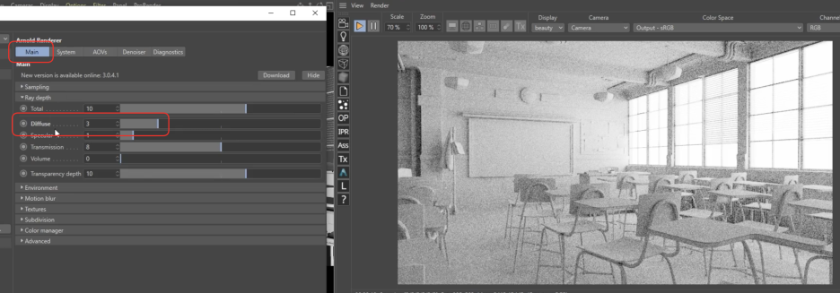 - Ray Depth (Diffuse): 실내 씬에서 반사 횟수(Bounce) 1은 불충분합니다. 최소 3~4회로 설정해야 물리적으로 정확하고 밝은 실내 이미지를 얻을 수 있습니다.