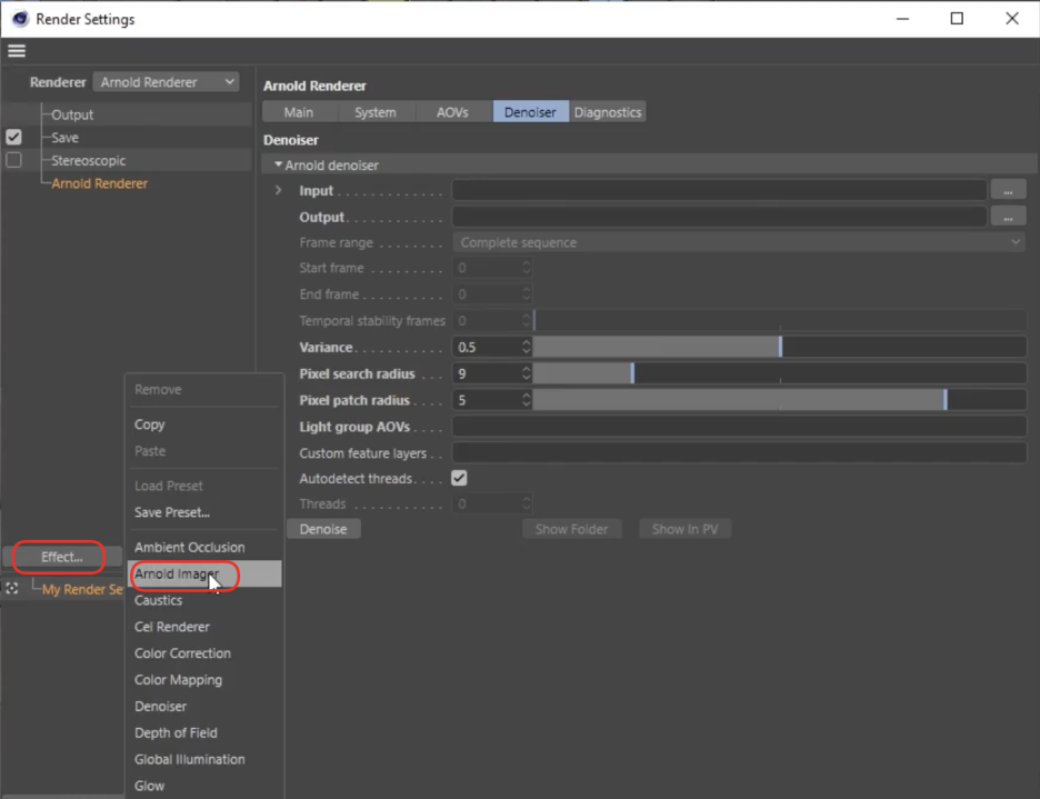 - 참고: 이미저가 직접 디노이징을 수행하므로 별도의 'Output Arnold Denoiser AOVs' 옵션은 켤 필요가 없습니다.