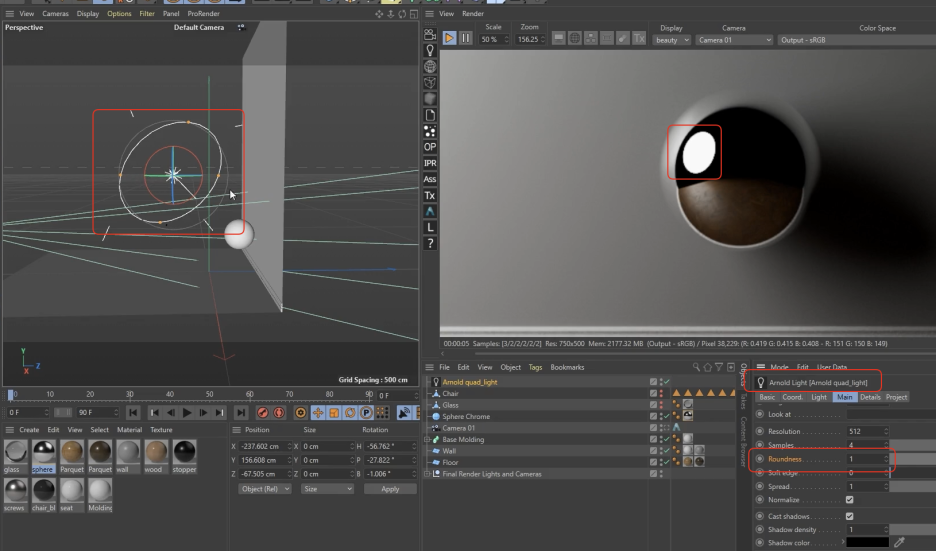 - Roundness: 0(사각형)에서 1(원형/디스크)로 조명의 모양을 바꿀 수 있습니다.