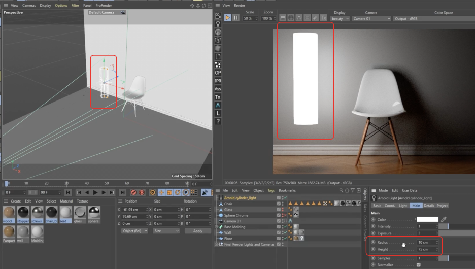 - 제어: **Radius(반지름)**와 Height(높이) 파라미터를 조절하여 광원의 크기를 결정합니다. 형광등이나 긴 막대 모양의 조명을 표현할 때 유용합니다.