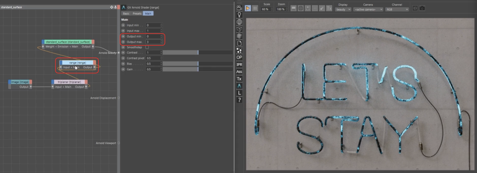 - 방법: Triplanar와 Emission Weight 사이에 Range 노드를 추가합니다.