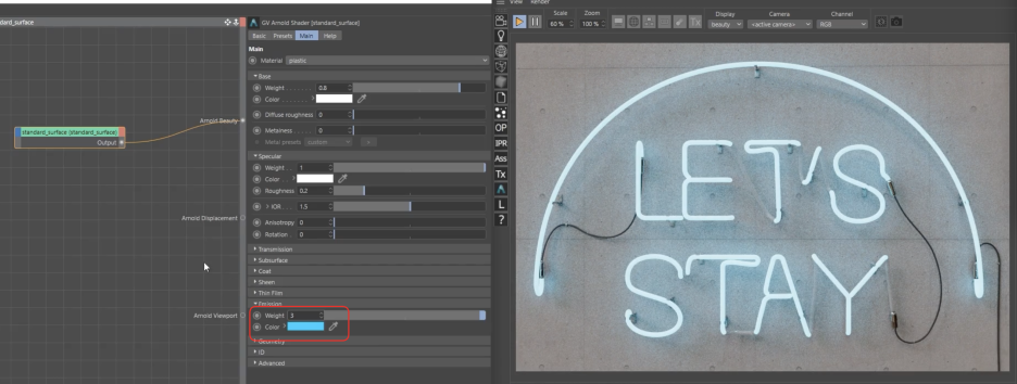 Arnold Standard Surface 셰이더의 Emission(발광) 섹션에 대한 내용입니다.