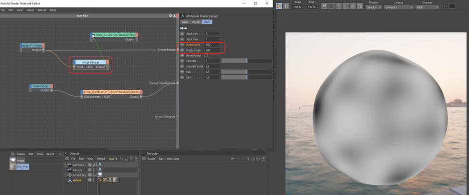 2. Range 노드를 추가하여 0~1의 출력 범위를 박막 두께에 적합한 250~500(nm) 정도로 변환합니다.