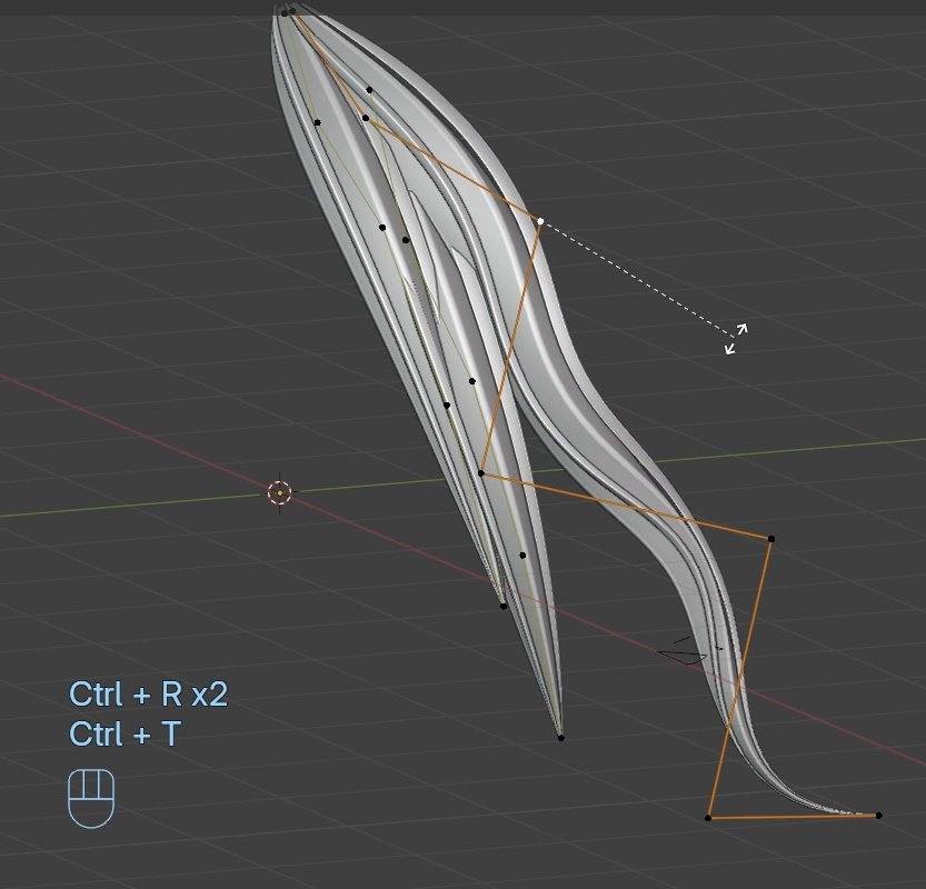 긴 헤어에도 잘 작동합니다. 예를 들어, 여기 이것을 가져와서 이런 헤어 모양을 더 만들 수 있습니다. 정말 멋진 곡선(curvy)모양을 만들 수 있습니다. **기울기(tilt)**를 가지고 놀 수도 있습니다. 더 **곱슬(curly)**하게 만들 수 있습니다. 예를 들어, Ctrl + T를 사용하면 이런 **꼬임(twist)**이 만들어집니다. 이것도 유용할 수 있습니다. 이렇게 **꼬임(twist)**을 만들고, 반대쪽도 Ctrl + T로 이렇게 만들고, 여기도 반대쪽도 Ctrl + T로 이렇게 만듭니다. 이제 Ctrl + T로 그렇게 만들면 훨씬 더 흥미로운 것을 가지고 놀 수 있습니다. 다시 Ctrl + T를 누르고, 또 다시 Ctrl + T를 누르면 이전보다 훨씬 더 흥미로운 것을 얻을 수 있습니다.