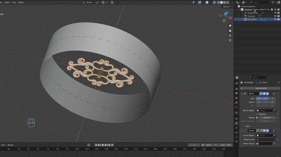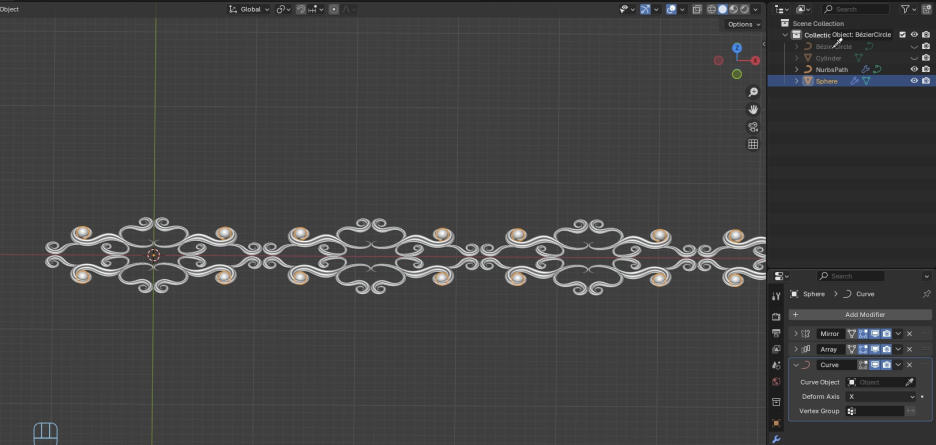 이 **진주(pearl)**에 **수정자(modifier)**를 추가하고 싶습니다. 이 **수정자(modifier)**는 X축과 Y축으로 **미러(mirror)**가 될 것입니다. 이렇게 네 개의 **진주(pearl)**를 얻었습니다. 이제 **배열 수정자(array modifier)**도 추가하고 싶습니다. 기본적으로 **요소(factor)**가 같지 않을 것입니다. 잘 맞도록 **요소(factor)**를 조정해야 합니다. 때로는 이 매개변수를 가지고 조금 놀면서 **개수(count)**를 늘려 전체 디자인을 잘 따르도록 해야 합니다. 이제 **곡선(curve)**도 추가하겠습니다. **수정자 곡선(modifier curve)**입니다. **베지어 원(bezier circle)**을 선택할 수 있습니다. 이제 **곡선(curve)**을 활성화하면 잘 따르고 **진주(pearl)**가 모든 곳에 있는 것을 볼 수 있습니다. 이제 **실린더(cylinder)**를 추가하면 모든 것을 얻었습니다. 여기 **음영(shading)**이 좋지 않으니, 여기서 **세분화(subdivision)**를 추가하여 더 나은 **음영(shading)**을 가질 수 있습니다. 이제 보세요. 모든 것이 들어있는 멋진 **객체(object)**를 얻었습니다.