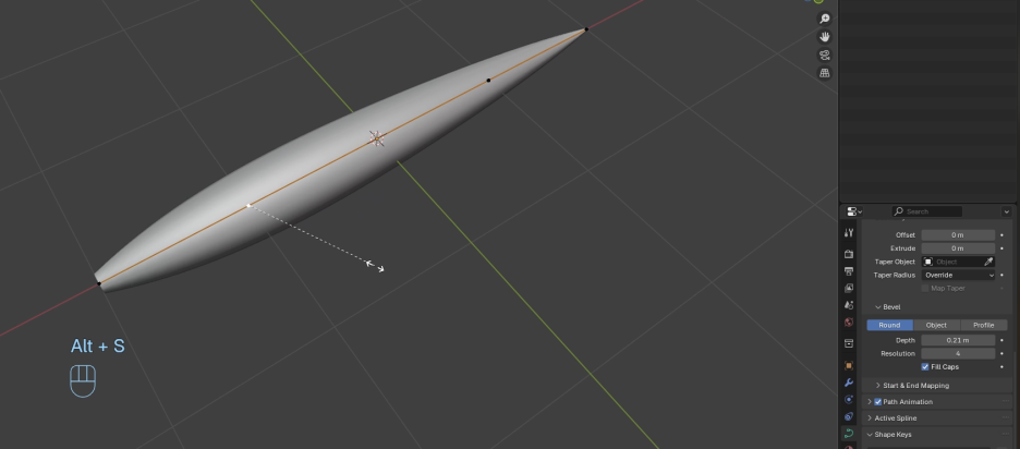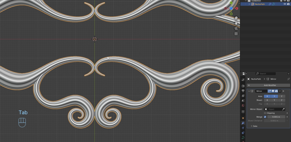 이제 그것을 해보겠습니다. 여기서 모든 것을 지우고 **경로(path)**를 추가하겠습니다. 이 **경로(path)**에 멋진 곡선(curvy) 모양을 만들겠습니다. 먼저 위로 올리고 아래로 내리겠습니다. 정사영(orthographic view)으로 가서 제가 잘 하는지 확인하겠습니다. 이제 이것을 **돌출(extrude)**하여 이런 움직임을 가진 **곡선(curve)**을 만들겠습니다. 이런 곱슬(curly)모양을 만들 것입니다. 나쁘지 않은 것을 얻었습니다. 마지막으로 하나 더 추가해서 이것을 갖도록 하겠습니다. 이런 모양은 흥미로울 수 있습니다. 이것은 원하는 것에 따라 다릅니다. 여기서 선택해서 이것을 조금 덜 크게 만들 수 있습니다. 이제 흥미로운 첫 번째 모양을 얻었습니다.