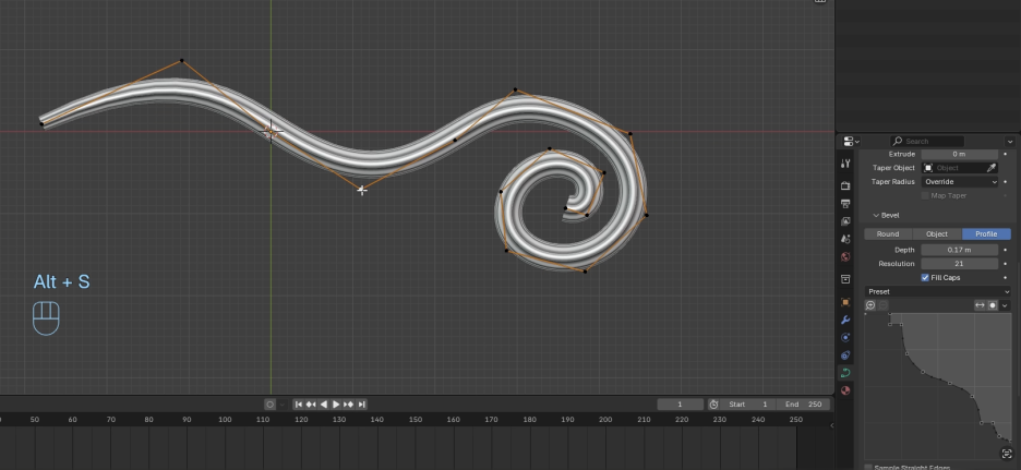 그리고 나서 **캡(cap)**을 채울 수 있습니다. **프리셋(preset)**도 있습니다. 기본적으로 **프리셋(preset)**은 기본값입니다. **서포트 루프(support loop)**가 있어서 반쯤 사각형 같은 모양을 만듭니다. **코니스 몰딩(cornice molding)**도 흥미롭습니다. **크라운 몰딩(crown molding)**도 흥미롭습니다. 그리고 **계단(step)**이 있습니다. 솔직히 저는 그것을 그렇게 많이 사용하지 않지만, 여기에 있습니다. 이 예제에서는 **코니스 몰딩(cornice molding)**을 사용하고 두께를 가지고 놀 것입니다. 두께를 Alt + S로 줄이고 Alt + S로 늘립니다. 조금 더 두꺼워야 하고, 부드럽게 가늘어져야 합니다. 이런 모양을 얻을 수 있습니다. 아주 얇게 될 때까지 말입니다. 이제 정말 멋진 것을 얻었습니다. 여기서 조금 더 늘릴 수 있습니다. 정말 멋진 것을 여기서 조금 더 늘릴 수 있습니다. 원하는 것에 따라 다르지만, 아주 얇은 것에서 아주 큰 것으로 갔다가 다시 아주 얇은 것으로 부드럽게 가는 것이 좋습니다.