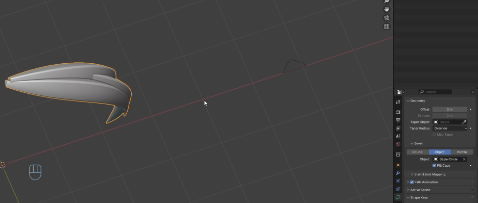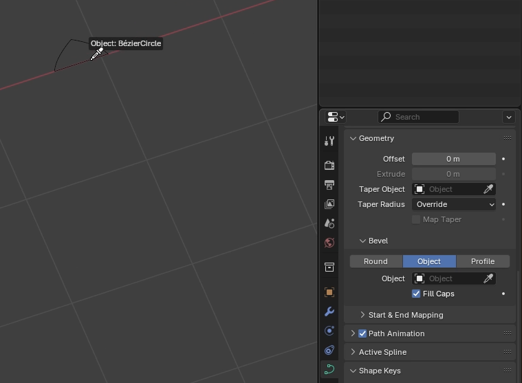 여기에 메시(mesh), 즉 **곡선(curve)**을 추가하겠습니다. 이것은 **경로(path)**가 될 것입니다. **경로(path)**로 할 수 있는 첫 번째 일은 **경로(path)**에 **베벨(bevel)**을 추가하는 것입니다. 지오메트리(geometry)에서 **베벨(bevel)**을 찾을 수 있습니다. 이것을 늘리면 이 모양을 얻을 수 있습니다.