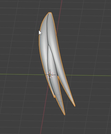 첫 번째로 할 수 있는 것은 Alt + S를 눌러 두께를 **축소(scale down)**하는 것입니다. 예를 들어, 저것을 **확대(scale up)**할 수도 있고, 멋진 모양을 만들 수 있습니다. 헤어를 만들기에 좋습니다. 예를 들어, 이런 모양이 있다면 정면도에서 정사영(orthographic view)으로 보면 이런 아주 간단한 모양을 만들어서 헤어를 만들 수 있습니다. 만화 캐릭터나 그런 것에 잘 어울립니다.