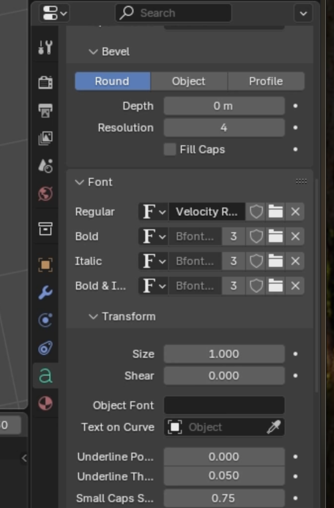 **글꼴(fonts)**도 변경할 수 있습니다. 기본적으로 컴퓨터의 글꼴 폴더로 이동합니다. 데모 파일에는 'velocity regular'라는 특정 글꼴이 있습니다. 이 글꼴을 열면 올바른 글꼴이 적용됩니다. **크기(size)**를 늘릴 수 있습니다. 이 텍스트 개체의 좋은 점은 **지오메트리(geometry)**에 대해 곡선과 똑같은 옵션을 가지고 있다는 것입니다.