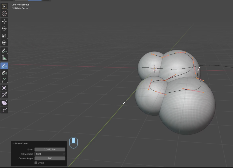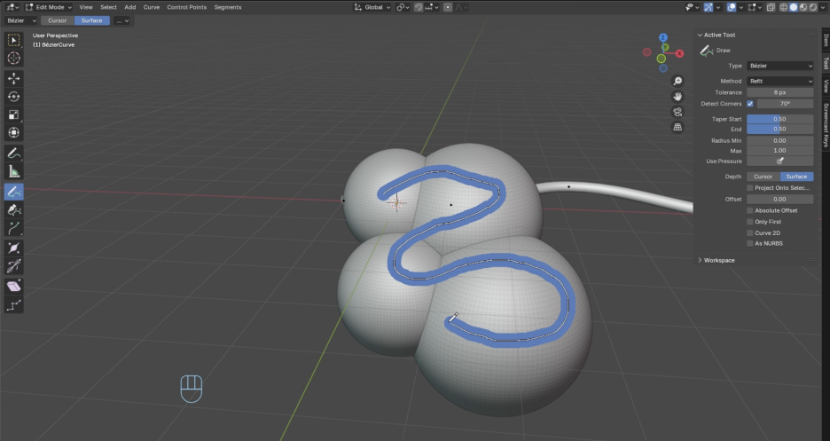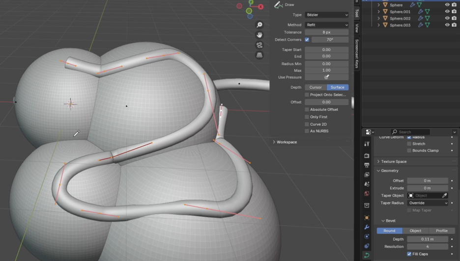 하지만 표면에 그리기(Draw on surface) 옵션은 매우 유용합니다. 예를 들어, 구(sphere)를 추가하고 Ctrl+2를 눌러 **세분화(subdivide)**한 다음, 복제하여 크고 작은 구들을 여러 개 만듭니다. 이제 커브의 편집 모드로 돌아가 그리기 도구에서 **표면 모드(Surface mode)**를 선택하면, 커브를 그릴 때 표면에 달라붙습니다. 이는 덩굴이나 식물을 그리거나, 표면에 도로 등을 그릴 때 매우 강력한 기능입니다.