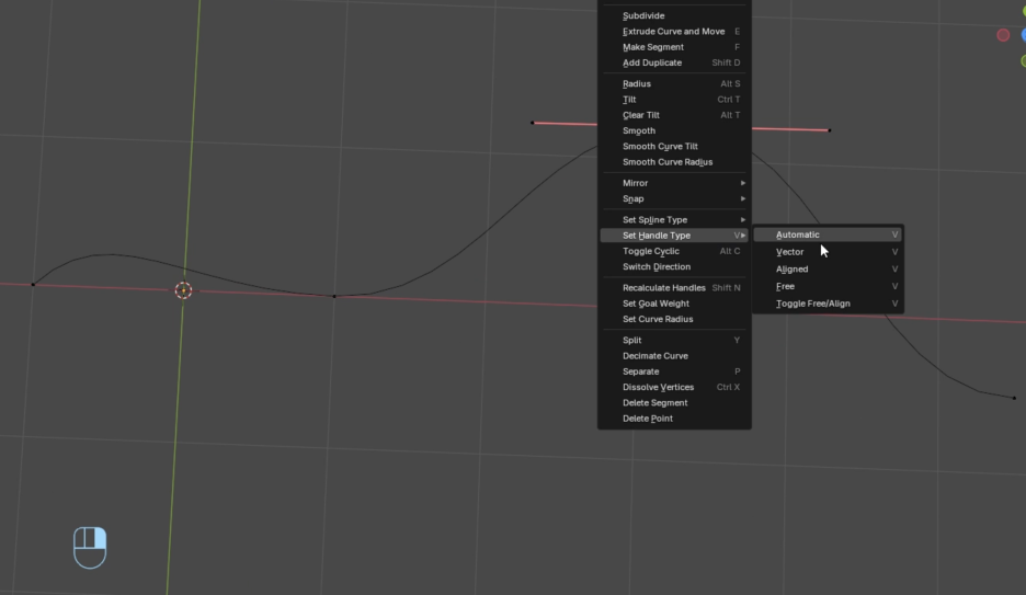 핸들 타입을 변경하는 기능도 있습니다. 기본적으로 정렬(Aligned) 타입이며, 이는 선으로 표시됩니다. 마우스 오른쪽 버튼을 클릭하여 **핸들 타입 설정(Set Handle Type)**을 선택할 수 있습니다.