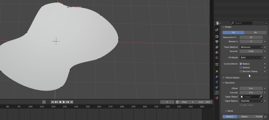 커브 데이터(Curve Data) 섹션에 몇 가지 지오메트리(Geometry) 옵션이 있습니다. 기본적으로 3D로 설정되어 있습니다.