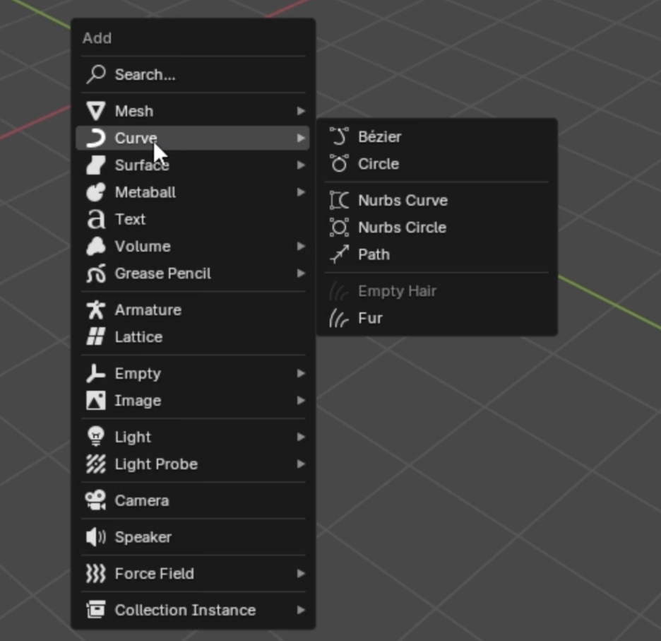 여기 몇 가지 오브젝트가 있습니다: 베지어(Bezier), 베지어 커브(Bezier Curve), 베지어 서클(Bezier Circle). 이들을 추가해 보겠습니다.