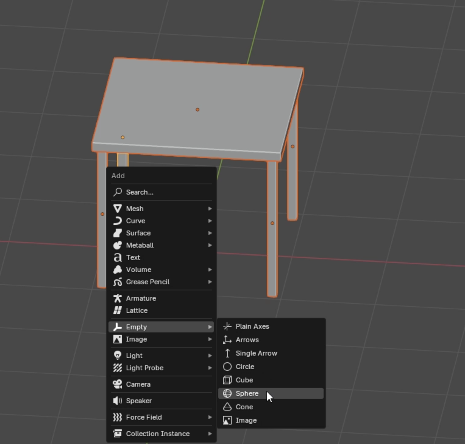Shift를 사용하여 모든 오브젝트를 선택하고, 마지막으로 이 오브젝트를 선택할 것입니다. 마지막으로 선택한 것은 노란색이고 다른 것들은 주황색입니다. 여기도 마찬가지입니다. 주황색, 그리고 노란색입니다. 이제 Ctrl P를 누르면 테이블 오브젝트를 엠티에 페어런팅할 수 있습니다. 두 오브젝트 사이의 관계를 나타내는 작은 선들이 보입니다. 이제 엠티를 잡으면 테이블을 어디든지 이동할 수 있습니다.