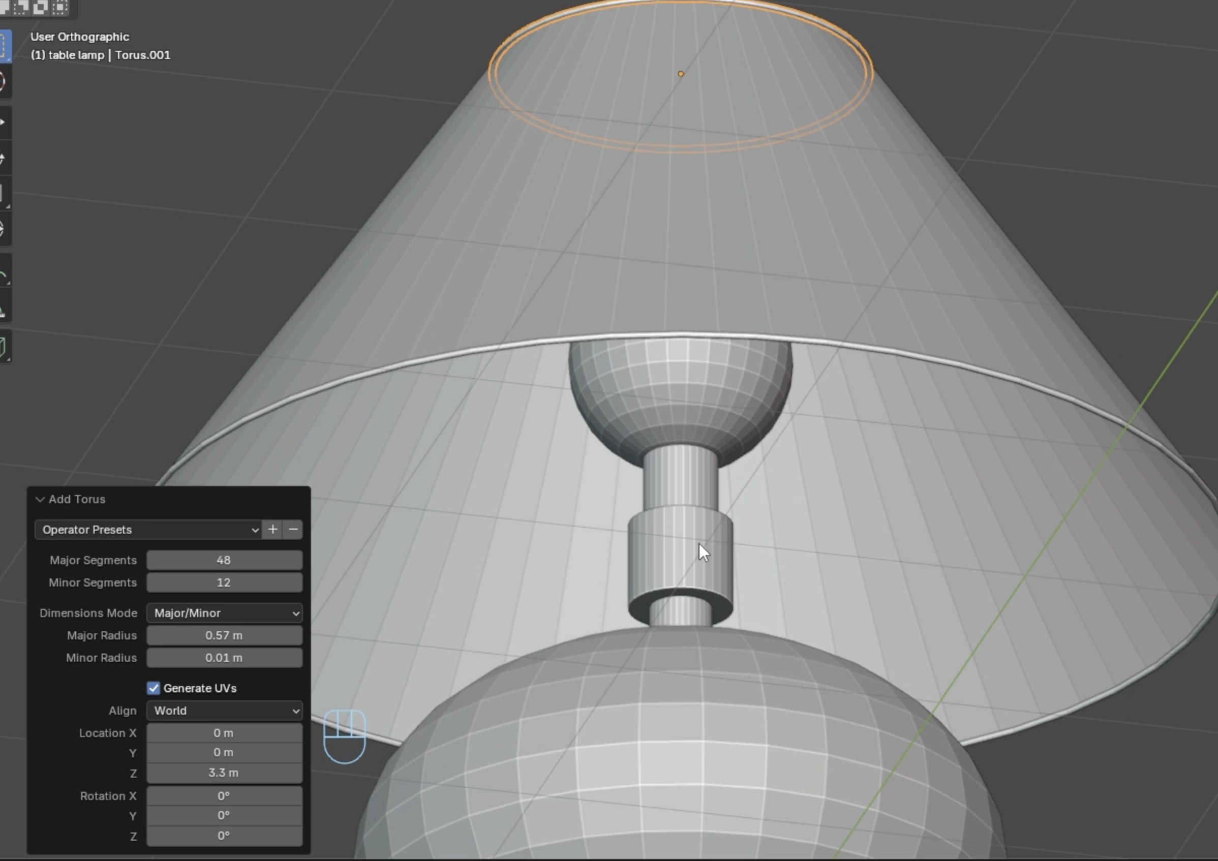 이제 전구를 포함한 모양을 가졌습니다. 완벽합니다. 그리고 나중에, 네, 편집 모드(edit mode)에서 편집 뷰(edit view)를 사용하면 이런 종류의 작업이 더 빠를 수 있지만, 오브젝트 모드(object mode)에서도 만들 수 있다는 것을 보여드리기 위함입니다. 좋습니다.