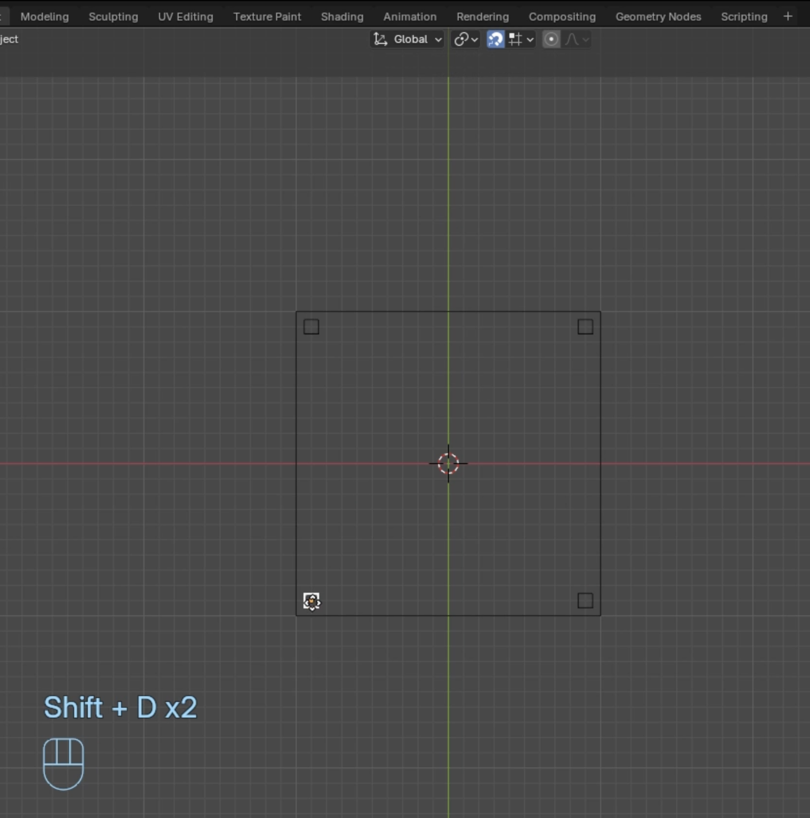이제 아마도 이런 것이 네 개 필요할 것입니다. 주변에 말이죠. 그래서 우리는 3D 커서(3D cursor)를 사용하여 **피벗 포인트(pivot point)**를 사용할 것입니다. 제가 회전시키면 커서 주변을 돌 것입니다. 커서가 중앙에 있기 때문입니다. 실수로 커서를 이동시켰다면, 여기서 값을 가지고 놀 수 있습니다. 위치를 0으로, 회전을 0으로 되돌리거나, Shift C를 눌러 중앙으로 되돌릴 수 있습니다.