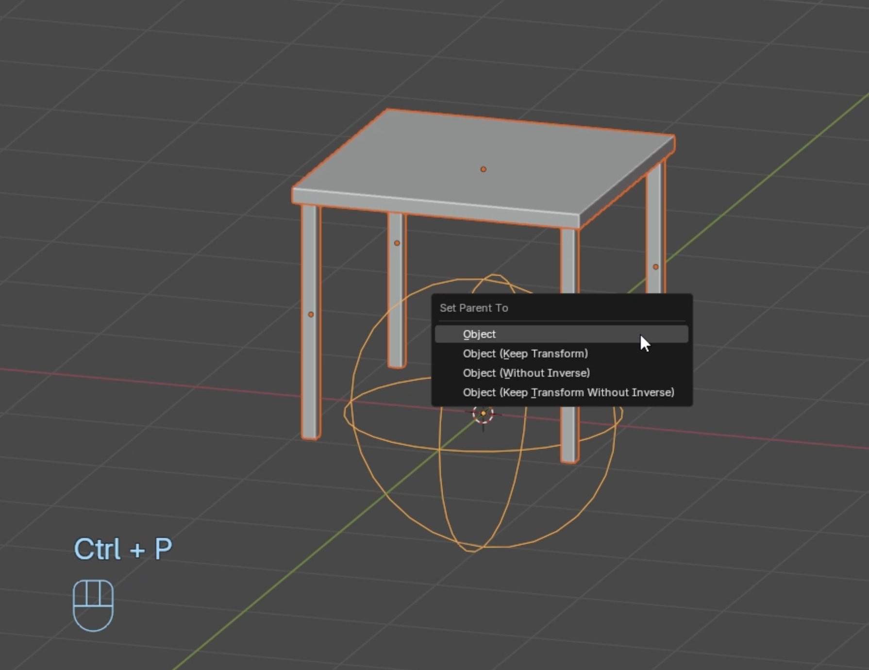 Shift를 사용하여 모든 오브젝트를 선택하고, 마지막으로 이 오브젝트를 선택할 것입니다. 마지막으로 선택한 것은 노란색이고 다른 것들은 주황색입니다. 여기도 마찬가지입니다. 주황색, 그리고 노란색입니다. 이제 Ctrl P를 누르면 테이블 오브젝트를 엠티에 페어런팅할 수 있습니다. 두 오브젝트 사이의 관계를 나타내는 작은 선들이 보입니다. 이제 엠티를 잡으면 테이블을 어디든지 이동할 수 있습니다.